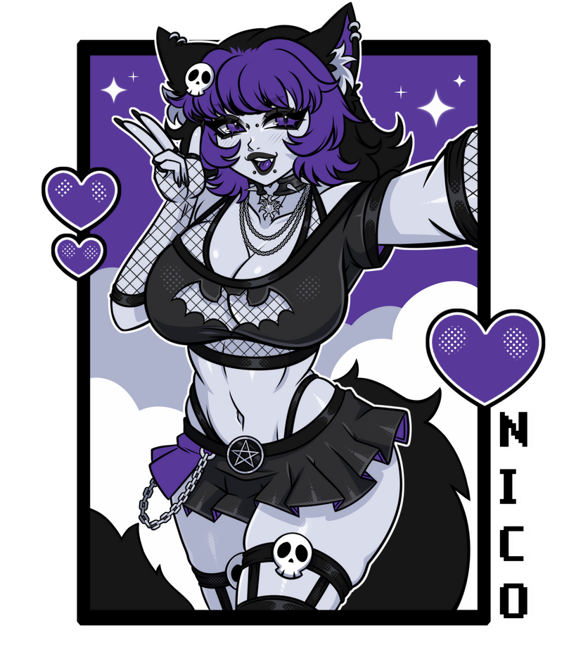 Nico is a goth cat girl vtuber who is obsessed with DBD. She goes by She/Her pronouns and is in love with Ghostface.Nico loves Gundam, Makeup, Hiking, Drawing, and Cooking/Baking. She loves Cats, Pastel Goth, Music, Gengar, Kuromi, and Ghostface.Nico's timezone is CST and she's a scorpio.Want to meet Nico? Check out her socials! (and bring plenty of Mountain Dew!)